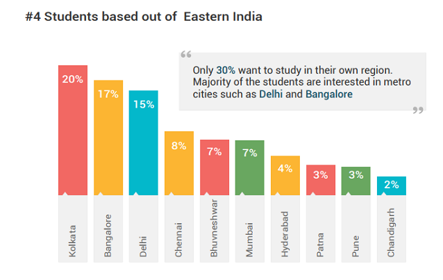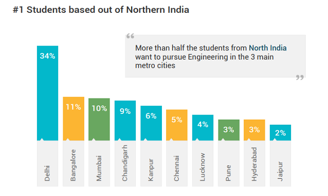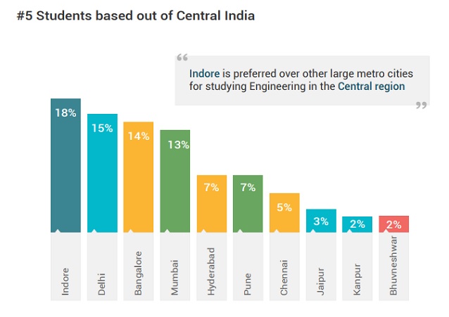The region-wise graphs below show relative popularity of top cities as voted by students based out of North, West, South, East and Central India as study destinations for engineering education.