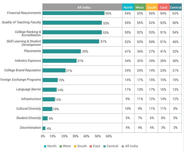 Students can have various kind of worries to deal with during the admission process. 'Financial requirements' is by far the most important concern of students across India except North and West where 'Quality of the teaching faculty' becomes a bigger concern. Most of these concerns are evenly spread across regions (as shown in the figure below).
