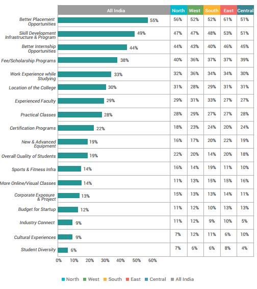 Apart from these, the region-wise survey also shows that students pay attention to aspects such as 'Scholarship programs', 'Work experience while studying' among other factors (as shown in the image below), while making up their mind about taking admission in a college.