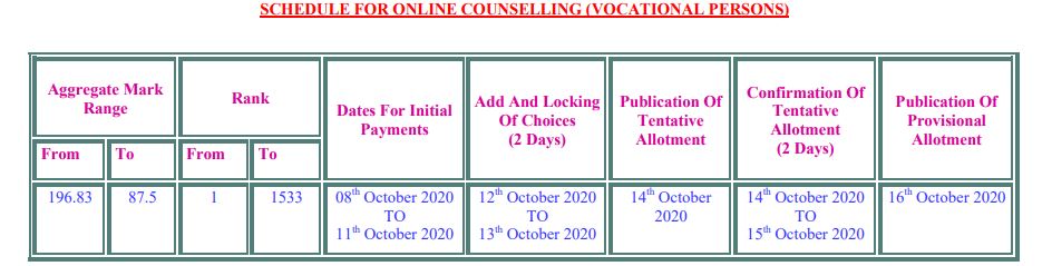 For Vocational stream, students with an aggregate score range from 196.83 to 87.5 who have secured ranks from 1 to 1533 are eligible to participate in the counselling.