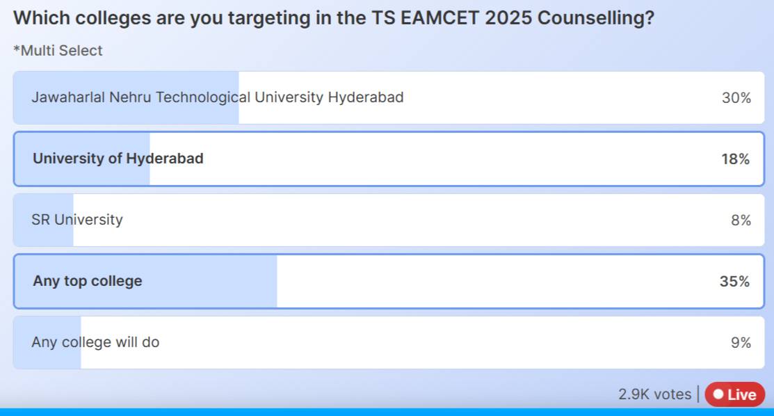 TS EMACET Counselling 2025: The JNTU Hyderabad has announced the TS EAMCET results 2025 on May 11, and the counselling of TS EAMCET 2025 has started. So, we conducted a LIVE POLL asking students, "Which colleges are you targeting in the TS EAMCET 2025 counselling?" The poll received over 2.9K votes so far and offers valuable insights into student priorities when it comes to college selection.