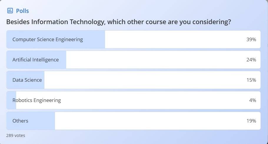 To assess student opinion, Shiksha.com conducted a poll asking, “Besides Information Technology, which other course are you considering?” Out of the 289 students that participated, 39% voted for CSE, 24% chose Artificial Intelligence, 15% voted for Data Science, 4% responded in favor of Robotics Engineering, and 19% are considering a few other options.