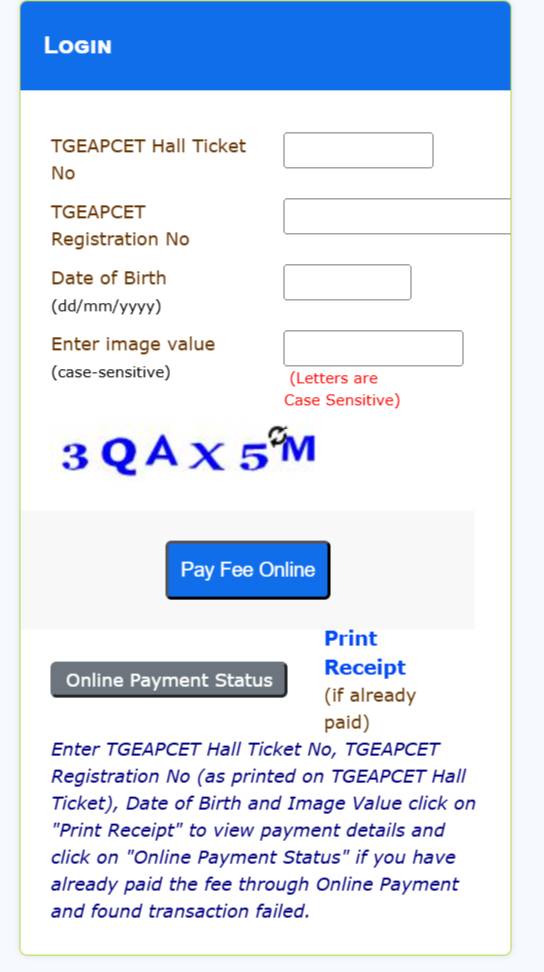 - Enter hall ticket number and TG EAPCET registration number (as mentioned on the hall ticket)