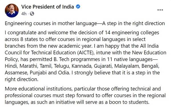 In a Facebook post titled ‘Engineering courses in mother language—A step in the right direction', posted in 11 Indian languages, the Vice President expressed his happiness over the decision of the All India Council for Technical Education (AICTE) to permit BTech programmes in 11 native languages—Hindi, Marathi, Tamil, Telugu, Kannada, Gujarati, Malayalam, Bengali, Assamese, Punjabi and Odia. He also welcomed the decision of 14 engineering colleges across eight states for offering regional languages in select branches from the new academic year. He said, “I strongly believe that it is a step in the right direction.”