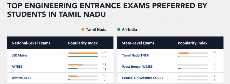 In Tamil Nadu, JEE Main is the most preferred engineering entrance examination followed by VITEEE in the category of National-Level exams. When it comes to State-Level exams, maximum students of Tamil Nadu prefer to appear in TNEA for engineering admission. Refer to the infographic depicted below for better understanding.