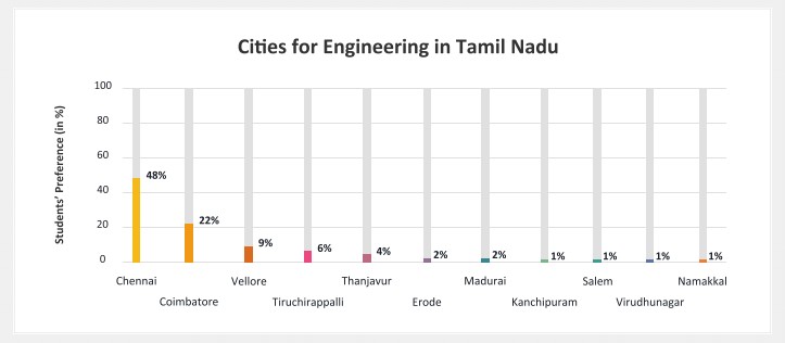 Chennai is favoured by 48% students seeking admission to engineering stream in Tamil Nadu followed by Coimbatore and Vellore that are preferred by 22% and 9% students respectively. Over 10% students who want to pursue engineering in Tamil Nadu prefer small cities like Thanjavur, Erode, Madurai, Kanchipuram, Salem, Virudhunagar and Namkkal.