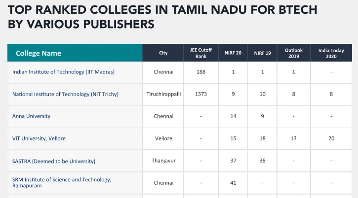 The list of top-ranked engineering colleges in Tamil Nadu include names of top-notch public and private institutes such as IIT Madras, NIT Trichy, Anna University, VIT University and many more. Check JEE Main cutoff, NIRF ranking and institutes ranking by Outlook & India Today of the top 5 engineering colleges of Tamil Nadu below.