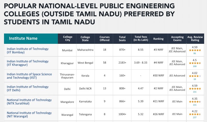 Students of Tamil Nadu mostly prefer admission to IIT Bombay followed by IIT Kharagpur and IIT Thiruvananthapuram. Apart from this, IIT Delhi and NIT Mangalore are in the list of top 5 public colleges in India preferred by Tamil Nadu students. Check total courses offered, total seats, total fee, ranking, accepting exams and average review rating of these colleges below.