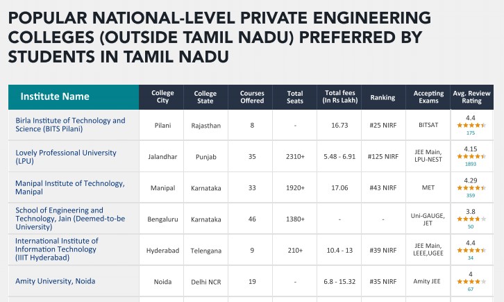 Among engineering institutes located outside Tamil Nadu, BITS Pilani is the first preference for admission by Tamil Nadu students. After that, Lovely Professional University and Manipal Institute of Technology are on the second and third spot in the top 5-preference list. Check total courses offered, total seats, total fee, ranking, accepting exams and average review rating of these colleges below.