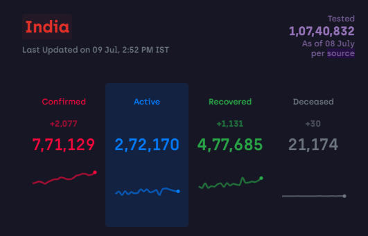As of July 09, 2020, the COVID-19 cases in all over India is 7,71,129 out of which active cases are 2,72,170 and 4,77,685 patients have recovered.