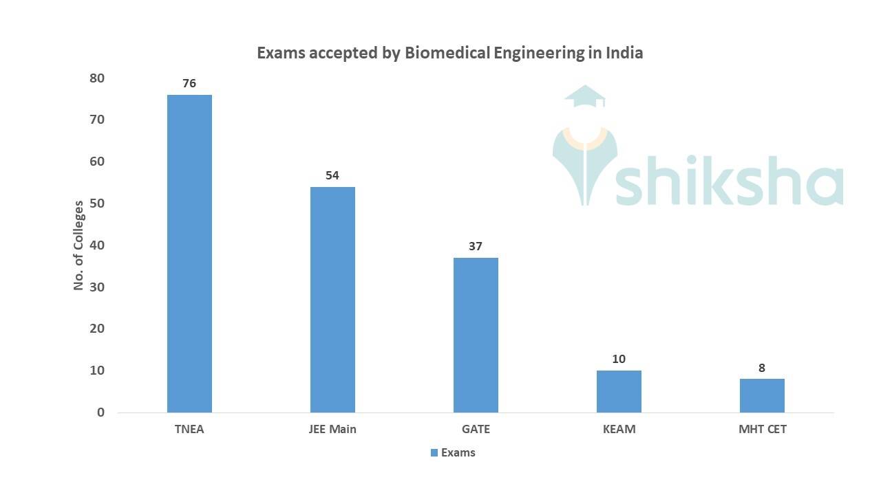 Approx. 17% of colleges has their annual fees ranging Approx. 16% of colleges has their annual fees ranging INR 1-2 lakh and some of them are: Approx. 14% of colleges has their annual fees ranging < INR 5 lakh and some of them are: The exams accepted by biomedical engineering colleges in India are TNEA, JEE MAIN, GATE, KEAM, MHT CET, NEET, TANCET, etc. Refer to the infographic for the detailed overview of exams accepted by biomedical colleges engineering colleges in India: Cut OffWhich are the most popular exams accepted by Biomedical Engineering Colleges in India?