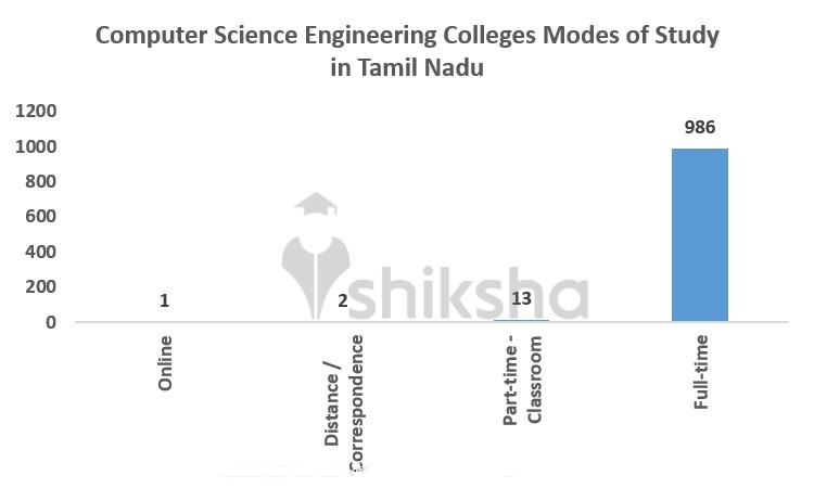 Computer Science Engineering courses in Tamil Nadu are offered in all – full-time, part-time, distance/correspondence and online modes. Nearly 990 courses are offered as full-time programmes, 13 as part-time course, 2 as distance/correspondence course and 1 as online programme.