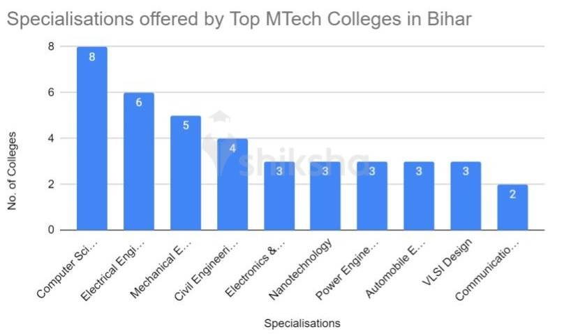 MTech colleges in Bihar offer diversified specialisations in Computer Science Engineering, Mechanical Engineering, Civil Engineering, Electronics and Communication Engineering, Electrical Engineering, Communications Engineering, Automobile Engineering, Power Engineering, Nanotechnology and so on. The most popular ones are Computer Science Engineering and Electrical Engineering followed by Mechanical Engineering. Refer to the infographic below to get a detailed overview of the top 10 specialisations offered by MTech Colleges in Bihar: