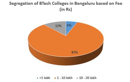 Based on the below pie chart, it can be estimated that pursuing BTech in Bengaluru is expensive as approximately 82% of the colleges have annual fees ranging from Rs 1-10 lakh. Some of these colleges are: