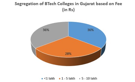 Based on the below pie chart, it can be estimated that pursuing BTech in Gujarat is expensive as approximately 36% of the colleges have a course/annual fees ranging from Rs 5-10 lakh. Some of these colleges are: