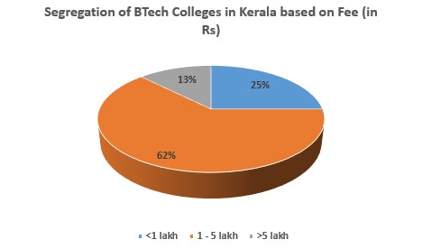 Based on the below pie chart, it can be estimated that pursuing BTech in Kerala is economical as approximately 62% of the colleges have a course/annual fees ranging from Rs 1-5 lakh. Some of these colleges are: