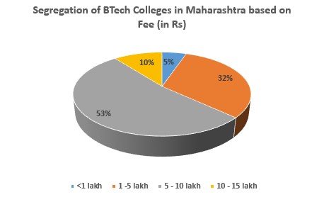 Based on the below pie chart, it can be estimated that pursuing BTech in Maharashtra is expensive as approximately 53% of the colleges have a course/annual fees ranging from Rs 5-10 lakh. Some of these colleges are: