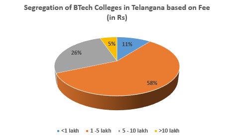 Based on the below pie chart, it can be estimated that pursuing BTech in Telangana is economical as approximately 58% of the colleges have a course/annual fees ranging from Rs 1-5 lakh. Some of these colleges are: