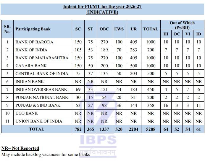 The official notification notified 5208 vacancies for the IBPS PO 2025 exam. The candidates can see here IBPS PO vacancies 2025 break-up for all banks.
