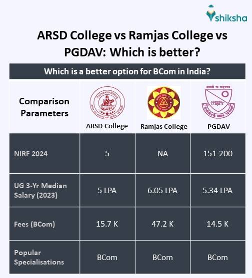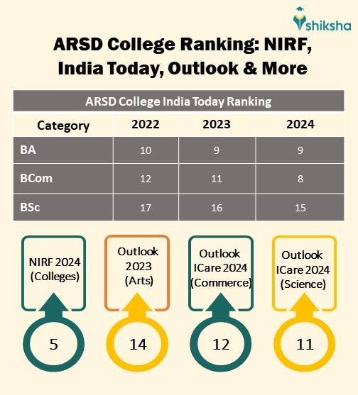 The latest BCom 2024 ranking trend of ARSD College has not been released. Based on the India Toady 2023 ranking under the 'Accounting & Commerce' category, the college has climbed 1 ranks to the #11 ranking psotion. However, in 2022 the college secured the #12 ranking position, by India Today. However, as per Outlook ranking trend the ARSD College secure #10 ranking position under the same category. As per the 'The Week' ranking body, the college secure #37 ranking postion under Accounting & Commerce category. This mentioned ranking trend shows that the college has fluctuation when compared with the previous year's ranking.