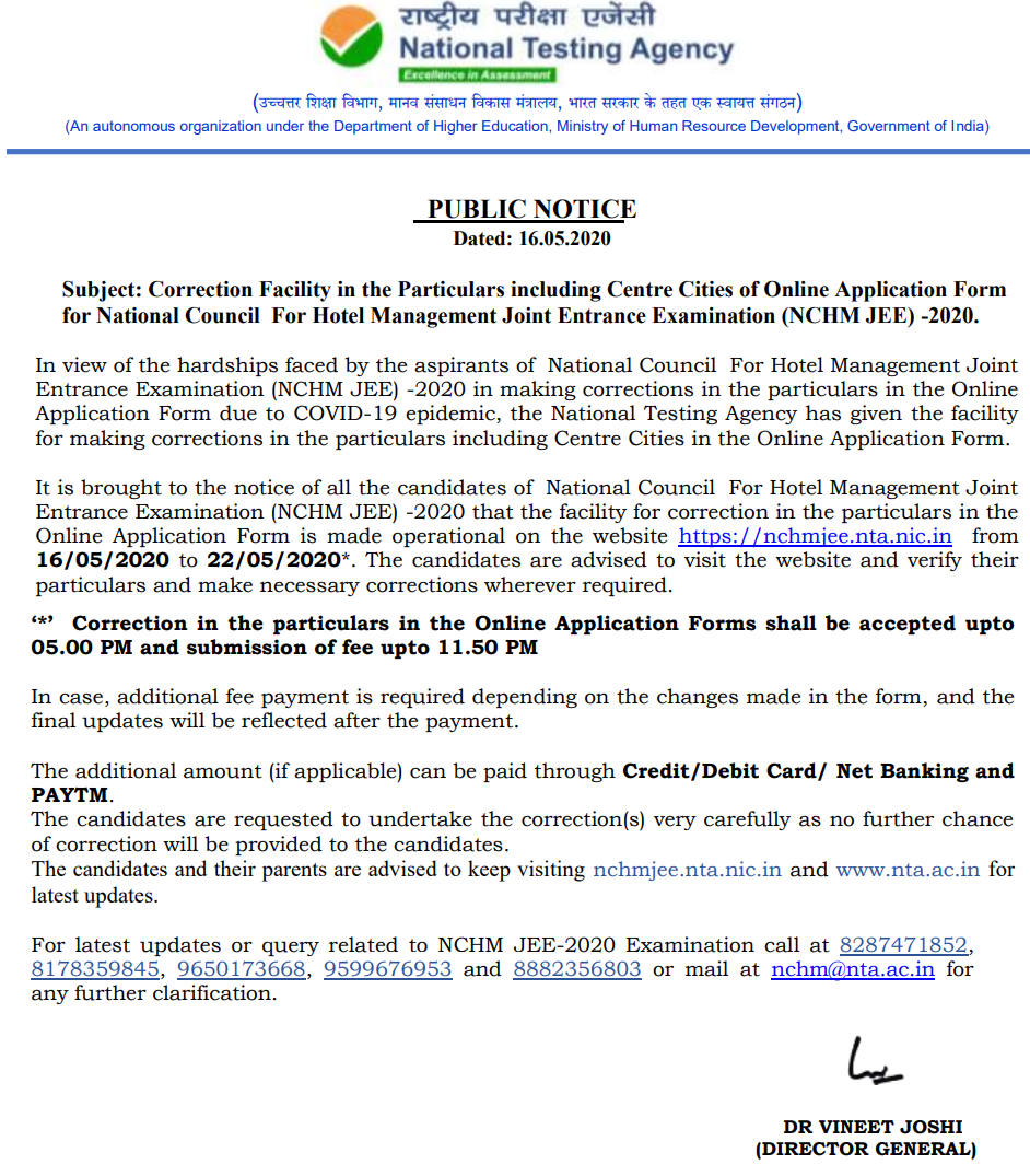Regarding the correction window, the official notification stated - It is brought to the notice of all the candidates of National Council For Hotel Management Joint Entrance Examination (NCHM JEE) -2020 that the facility for correction in the particulars in the Online Application Form is made operational on the website https://nchmjee.nta.nic.in from 16/05/2020 to 22/05/2020*. The candidates are advised to visit the website and verify their particulars and make necessary corrections wherever required. Correction in the particulars in the Online Application Forms shall be accepted up to 05.00 PM and submission of fee up to 11.50 PM"