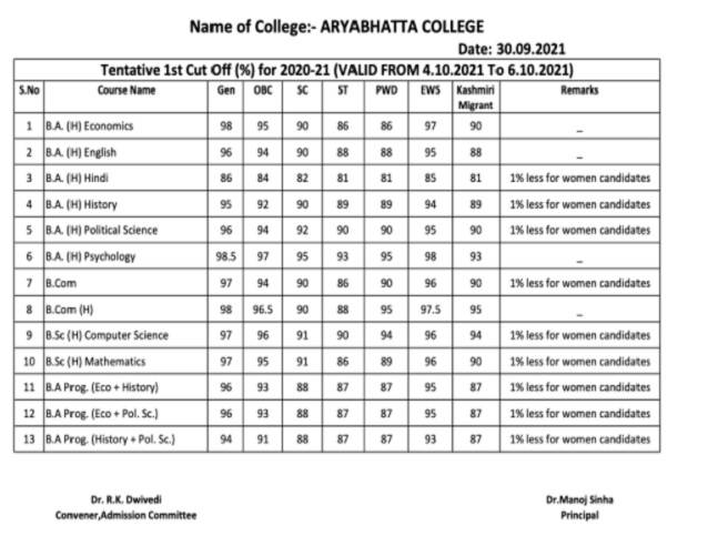 - October 9, 2021 (04:00 pm): DU 2nd cutoff 2021: Aryabhatta College's 2nd List