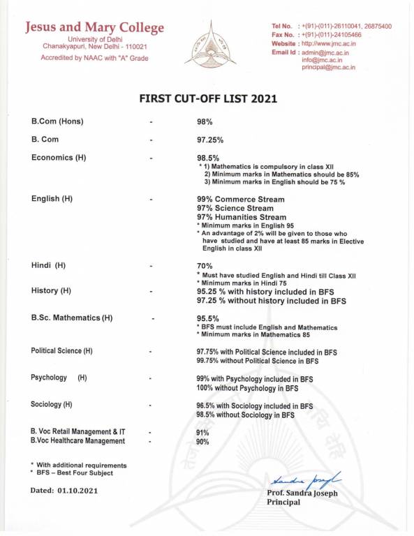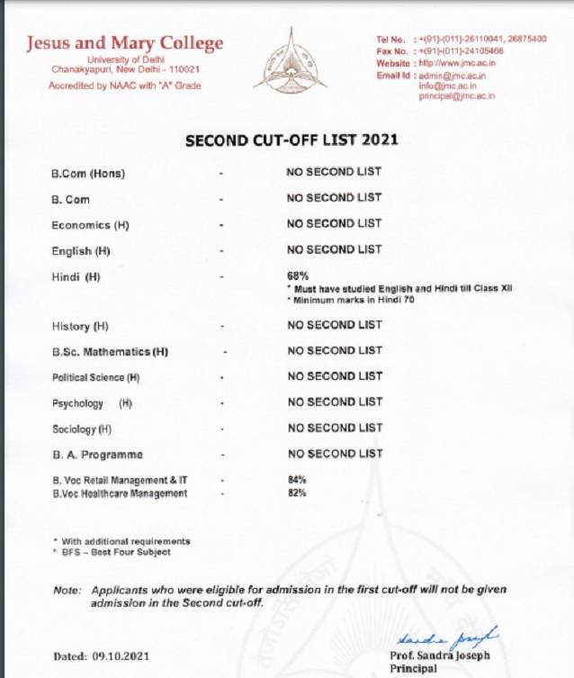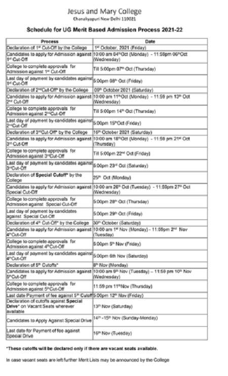 - October 9, 2021 (10:45 am): DU 2nd Cut off 2021:Jesus And Mary College second cut-off released