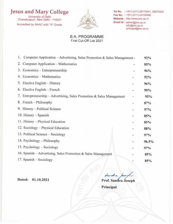 - October 9, 2021 (11:00 am): Jesus And Mary College sets 100 per cent cutoff for Psychology
