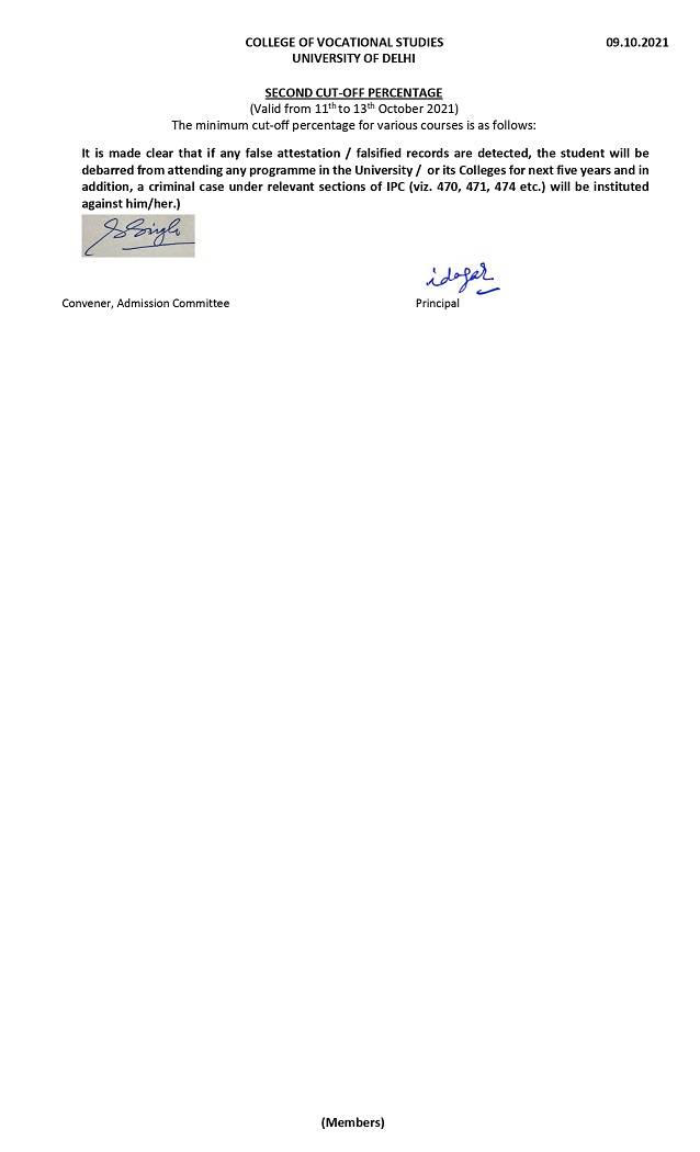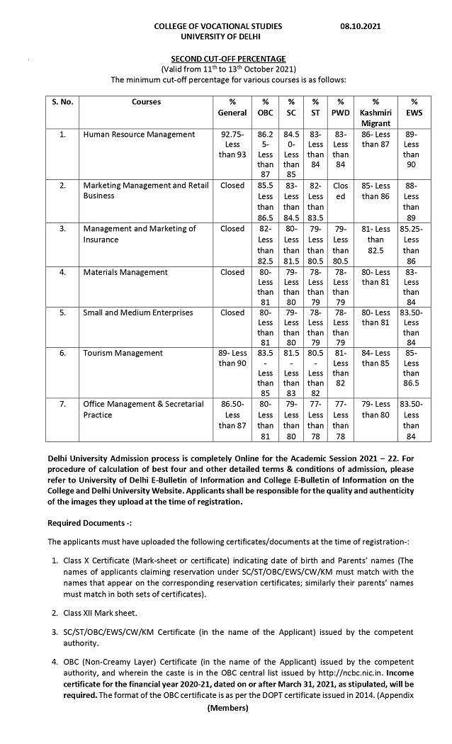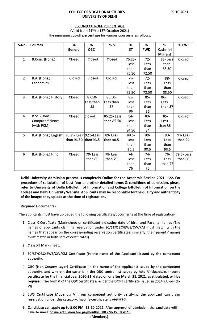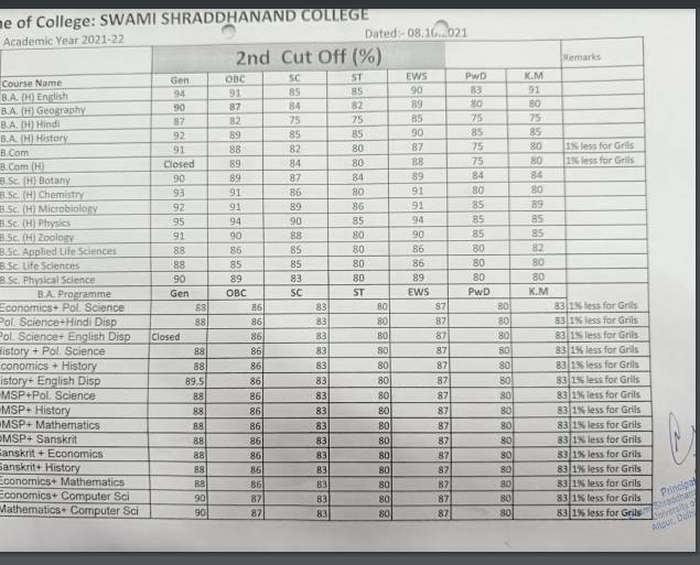 - October 9, 2021 (05:30 pm): Swami Shraddhanand College Second Cutoff released