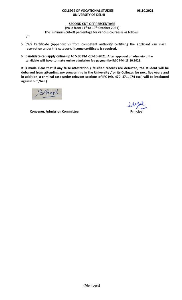 - October 9, 2021 (03:00 pm): College of Vocational Studies 2nd Cutoff 2021 released