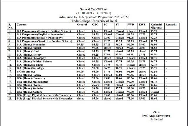 - October 9, 2021 (08:00 pm): Hindu College 2nd Cutoff list 2021