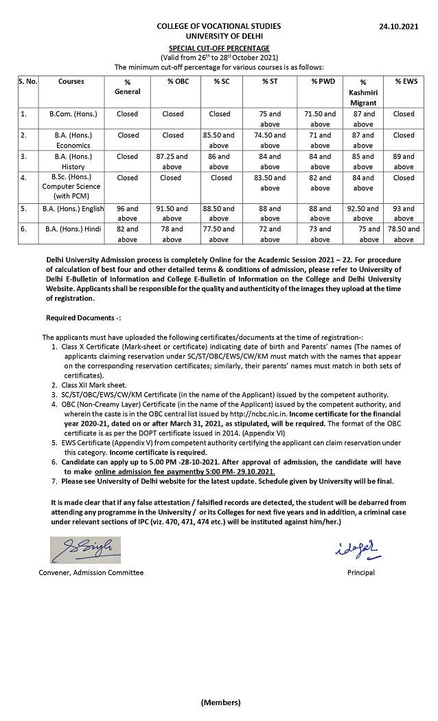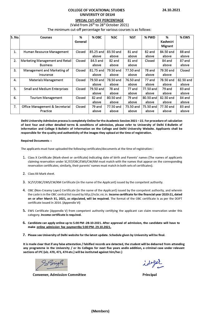 - November 8, 2021 (03:00 pm): College of Vocational Studies releases CVS fifth cut-off 2021