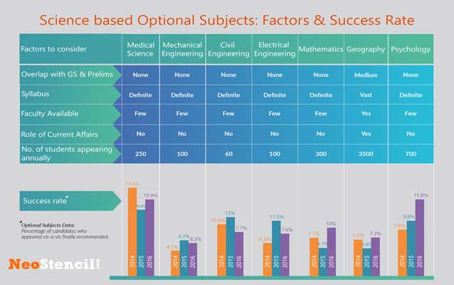 Explore preceding year’s papers to understand the pattern of questions asked in various subjects. Try to analyze if these are the kinds of questions you can score highly in your chosen subject. There is a difference in loving a subject and being able to score well with it. Some subjects score high like Geography, with 400+ returned marks with in IAS Mains. You can choose a subject that can supplement your Mains scores based on your confidence in your GS paper. Agriculture and Medical Science have high success rates as of 2016, with Animal Husbandry, Veterinary Science & Economics scoring close seconds.