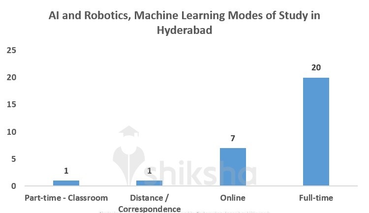 AI and Robotics, Machine Learning courses in Hyderabad are offered in all – full-time, online, part-time and distance/correspondence modes. 20 courses are offered as full-time programmes, 7 as online course, 1 as part-time course and 1 as distance/correspondence programme.