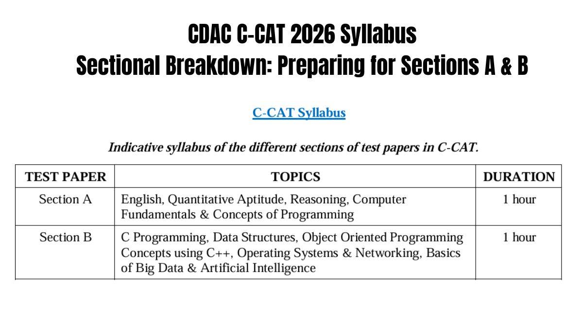 The CDAC Common Admission Test (CDAC C-CAT) 2026 is the main entrance test for admission to CDAC PG Certificate Programmes. Check the detailed sectional analysis of Sections A (General Aptitude & Fundamentals) and B (Programming & Computer Concepts) of the C-CAT syllabus. You will also learn which topics are important, how to prepare for them, recommended books, and exam strategies.
