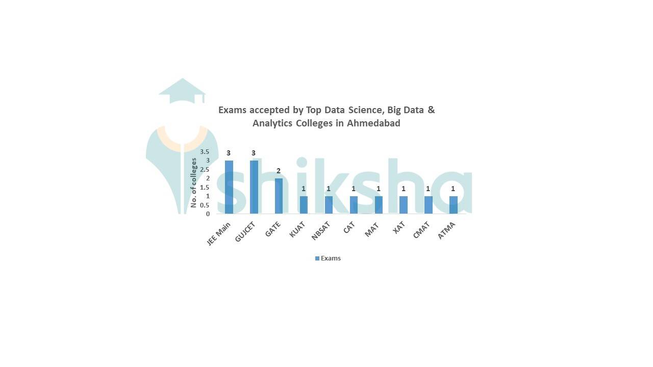 Top entrance exams accepted by Data Science, Big Data and Analytics colleges in Ahmedabad include GATE, NBSAT, MAT, XAT, CAT and CMAT score.