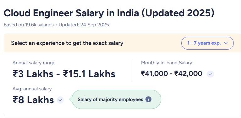 The average salary of a cloud engineer in India is INR 8 LPA, with the available salary range of INR 3 - 15 LPA.