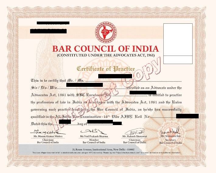 All candidates clearing the examination as per the parameters, that is, qualifying marks and eligibility criteria, are issued the Certificate of Practice by BCI as under: