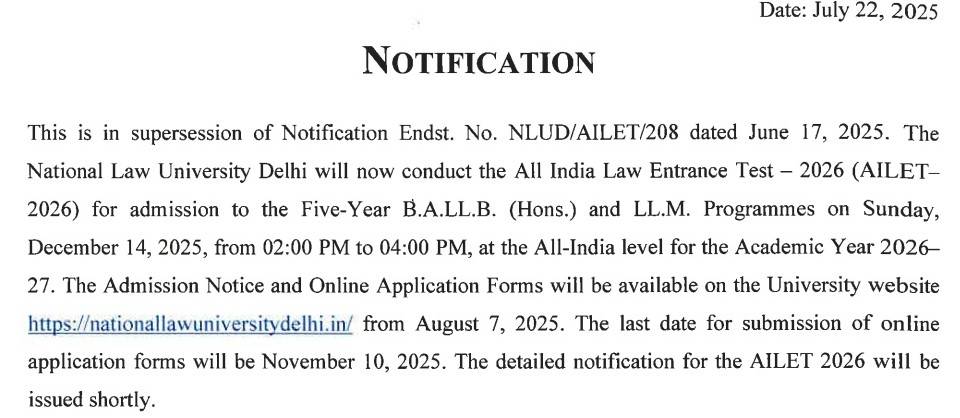 The AILET Notification 2026 for admission to 5-year integrated BALLB and LLM programs at the NLU Delhi was published on June 17, 2025 on the official website- nationallawuniversitydelhi.in. However, NLU Delhi released a revised notification for AILET 2026 on July 23, 2025, stating the revised exam dates and application dates. AILET Registration for BA LLB and LLM programs was commenced from August 07, 2025 through NLU Delhi official website.