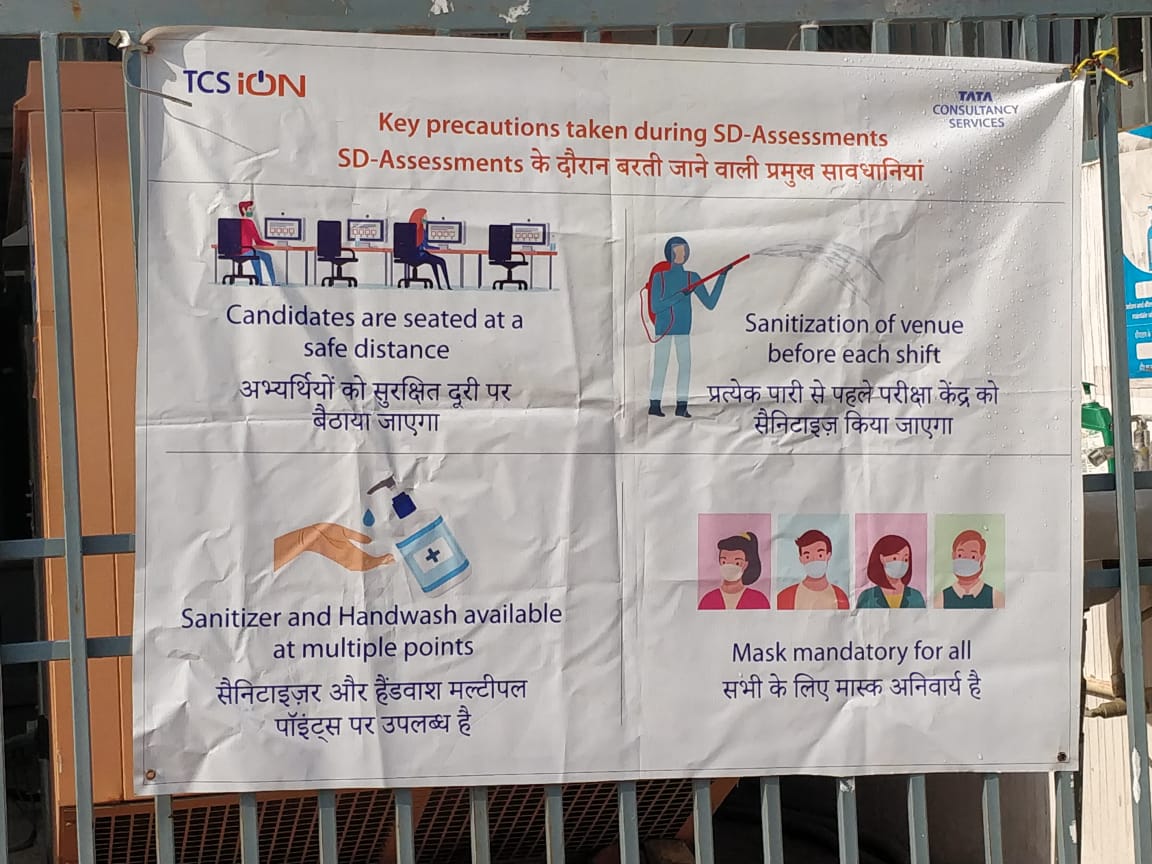 The exam centre officials have placed COVID-19 safety instructions at the entry gate of the examination hall for the candidates taking the exam. Moreover, they ensured the social-distancing norms are followed by the candidates.