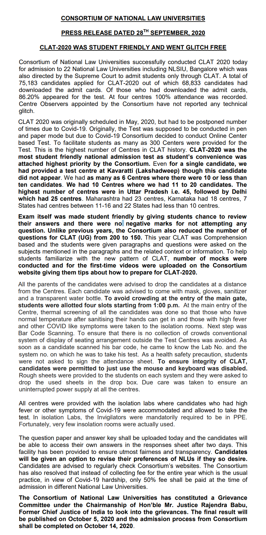 CLAT Consortium has released notification once the exam got over sharing the details of CLAT 2020 as conducted today. According to the notification, "A total of 75,183 candidates applied for CLAT-2020 out of which 68,833 candidates had downloaded the admit cards. Of those who had downloaded the admit cards, 86.20% appeared for the test. At four centres 100% attendance was recorded. Centre Observers appointed by the Consortium have not reported any technical glitch.