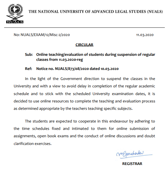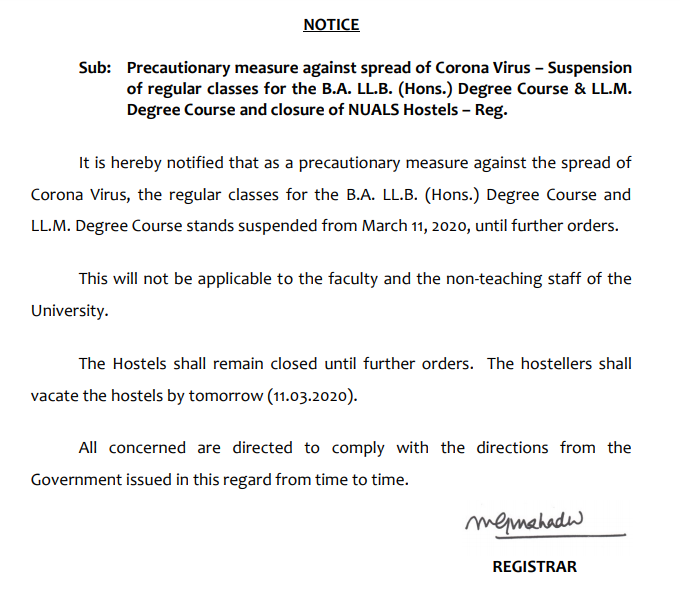 Precautions for Coronavirus – NUALS has suspended all the classes and closed hostels w.e.f. March 11 until further notice as under: