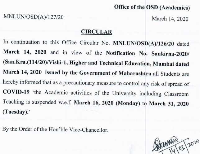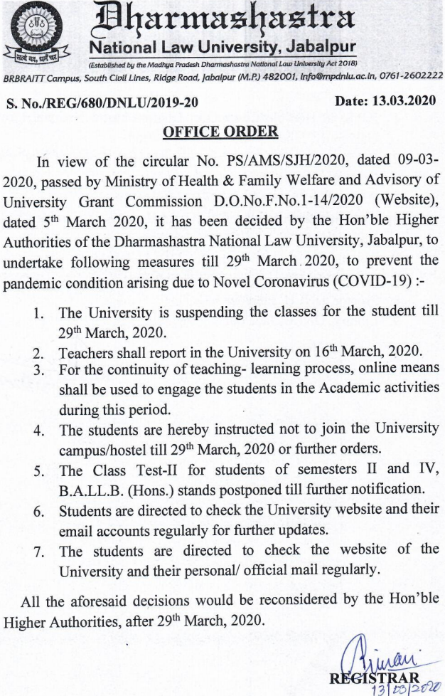Precautions for Coronavirus – The university has deferred all the classes, mid-term exams, workshops and events until further notice. Check below latest updates at GNLU: