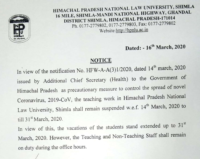 Precautions for Coronavirus – HNLU Raipur has formed a 16-member committee to monitor Coronavirus situation on the campus. Moreover, all classes are suspended up to March 31; a notification regarding the same has been published on the website as under: