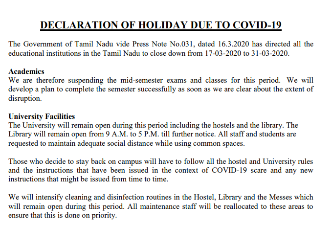 Precautions for Coronavirus – The university has suspended all the classes and examinations with effect from March 14, 2020, and the students were asked to vacate hostels. The teaching and non-teaching staff of RGNUL will remain working even though the classes are suspended until March 31. The notice regarding the same: