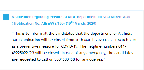 Precautions for Coronavirus – As a preventive measure towards COVID-19, the Bar Council of India (BCI) has closed the department of AIBE and its helpline (landline) numbers from March 20 to 31, 2020. Check the notification below:
