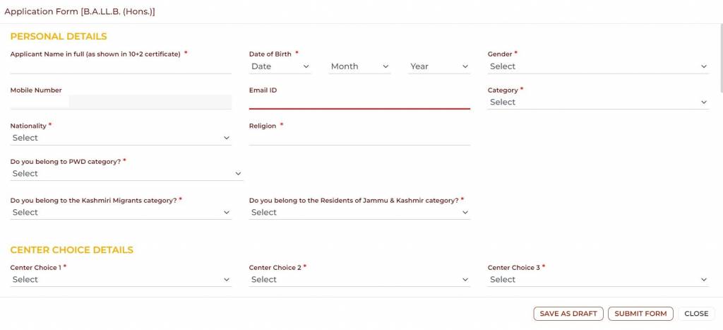 - Fill all the details carefully. The NLU Delhi will send an application ID and password on the registered mobile number
