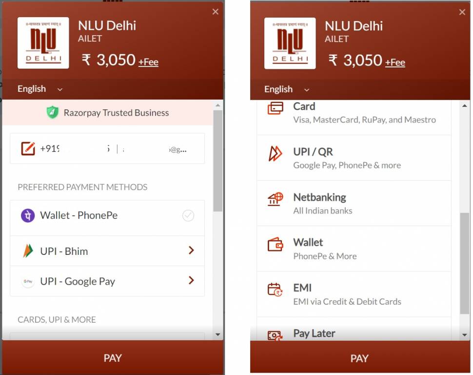 - The application fee to be paid as per the category and course will appear on the screen as a popup, candidates will then have to select their method of payment from the options below:
