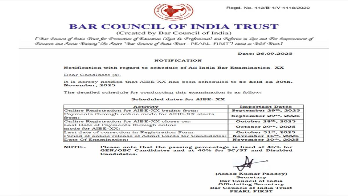 AIBE 20 Exam 2025: The AIBE 20 Application Process 2025 is currently underway. The last date fill AIBE 20 Application formis on or before October 28, 2025. All India Bar Examination (AIBE) Notification 2025. carried all the important details about the exam. Once you clear the AIBE Exam, the BCI will issue the Certificate of Practice , which is mandatory for lawyers to represent any case in court.