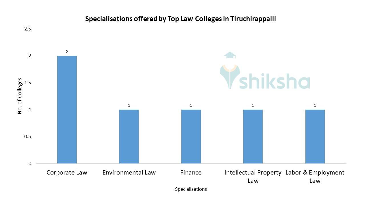 There are several specialisations offered by law colleges in Tiruchirappalli are Corporate Law, Environmental Law, Finance, Intellectual Property Law, Labor Environmental Law, Business Law, Commercial Law.